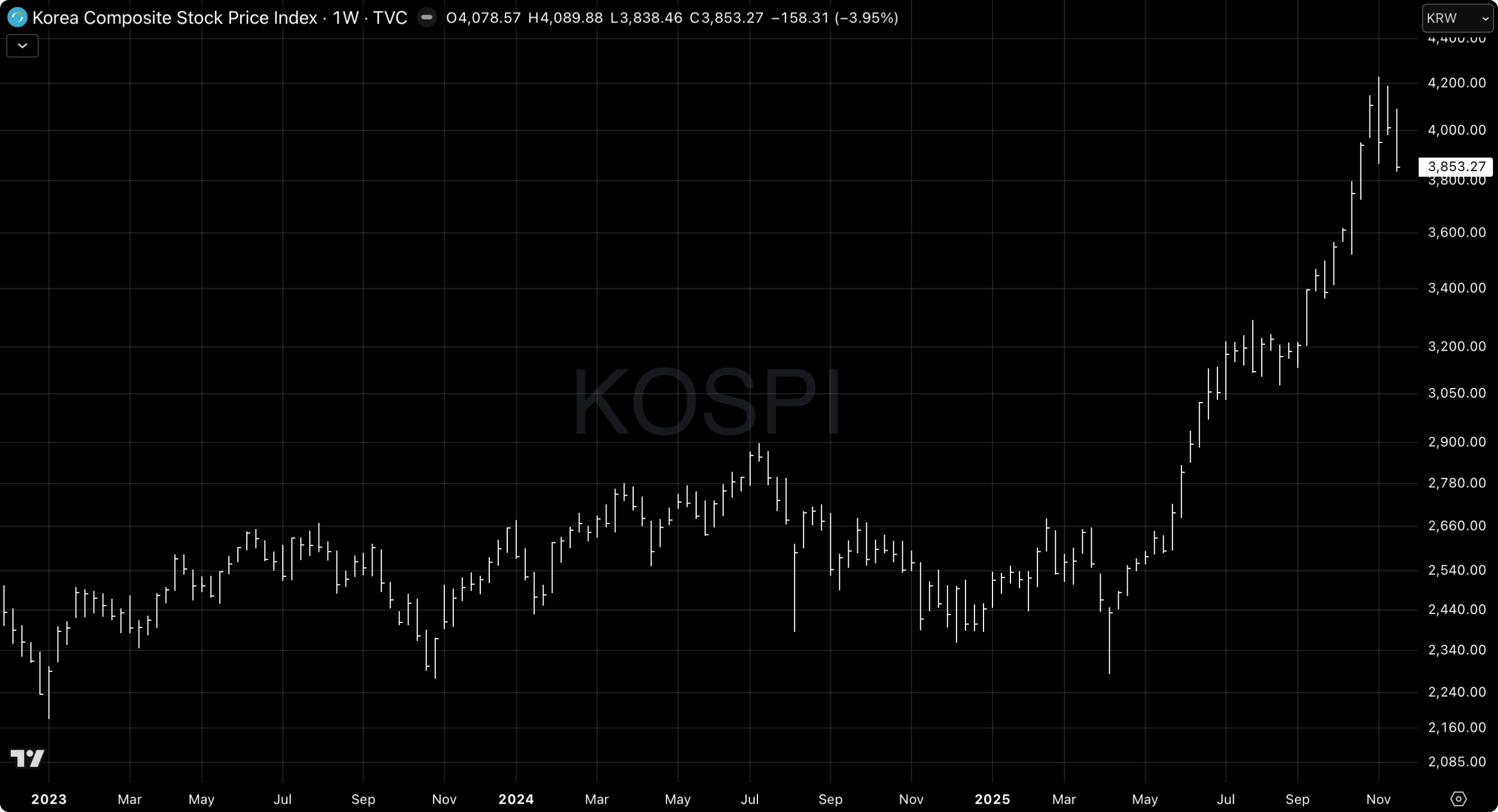 ๐ฐ๐ท KOSPI fell 3.95% in what seems like a healthy pause. The index is up more than 60% year-to-date.